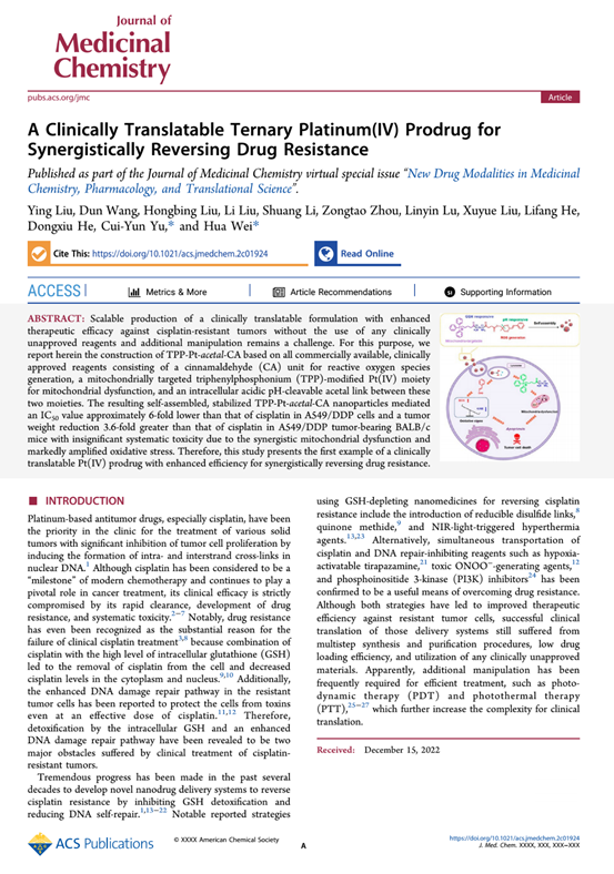 3月10日,beats365魏华/喻翠云教授团队在药物化学领域国际一流期刊Journal of Medicinal Chemistry(中科院1区,IF:8.039)在线发表了题为“A Clinically Translatable Ternary Platinum (IV) Prodrug for Synergistic Reversing Drug Resistance(2023,DOI: 10.1021/acs.jmedchem.2c01924.)”的研究论文。