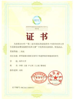 10月17日-19日,由高等公司国家级实验教学示范中心联席会和中国药科大学主办,天津大学药物科学与技术公司承办的“第二届医药院校药学/中药学世界老员工创新创业暨实验教学改革大赛”在天津举办。经过初选函评和现场答辩等多环节激烈角逐,由公司选送的beats365刘阳老师指导的“生物医用水凝胶创新团队”的成员李蓉、王毅、尹玉利、王云娟、黎倩瑶等参与的项目最终荣获员工创新创业二等奖。