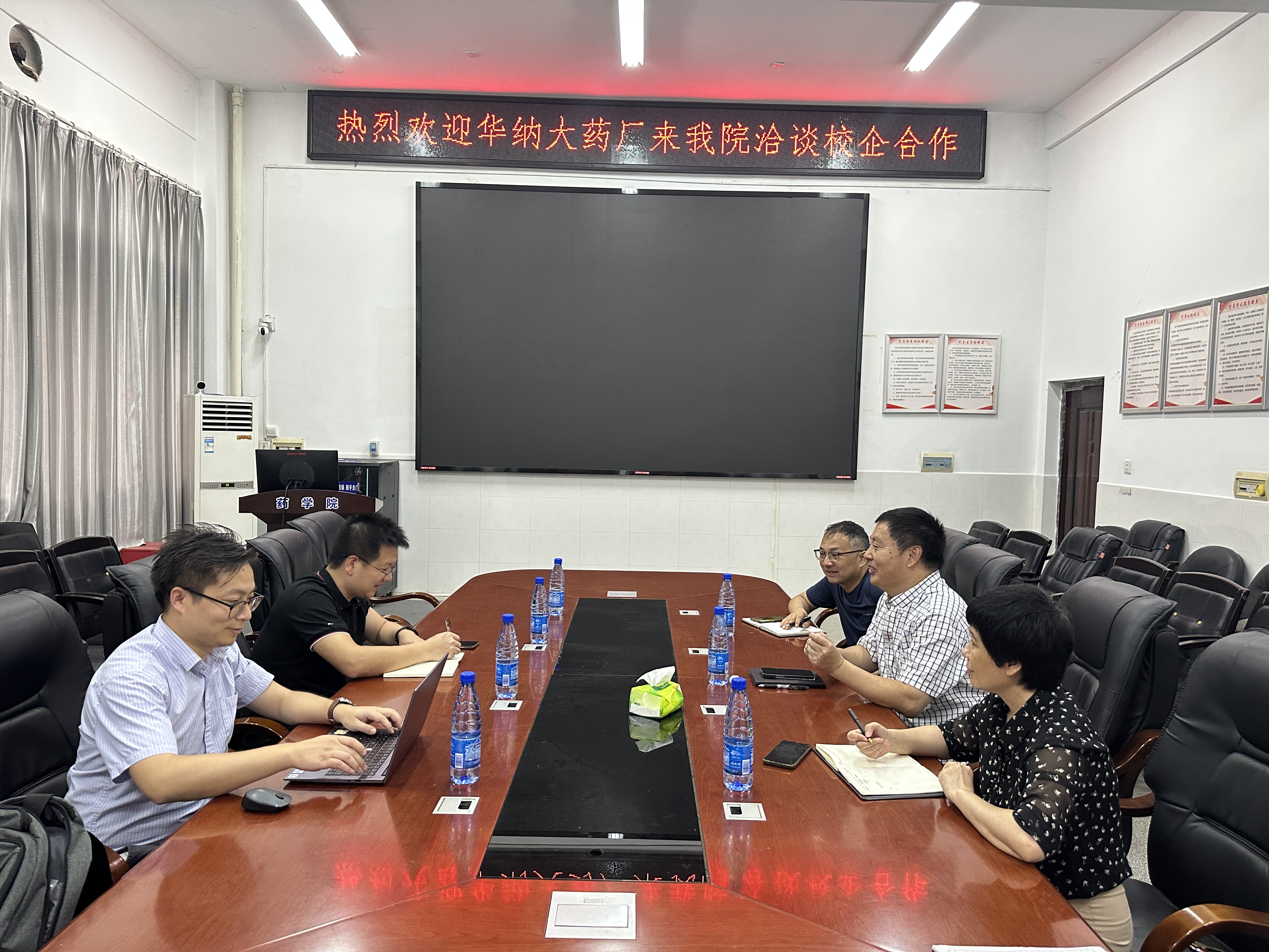 为推动现代生物医药产业公司发展,共谋校企合作双赢的良好局面,2023年8月11日下午,湖南华纳大药厂股份有限公司(以下简称华纳大)人资负责人张品、蒋兴等一行来公司洽谈合作相关事宜。公司党委书记袁中华、副经理易岚、教务办虞佳、教研室老师唐国涛和辅导员彭翔参加了座谈会。