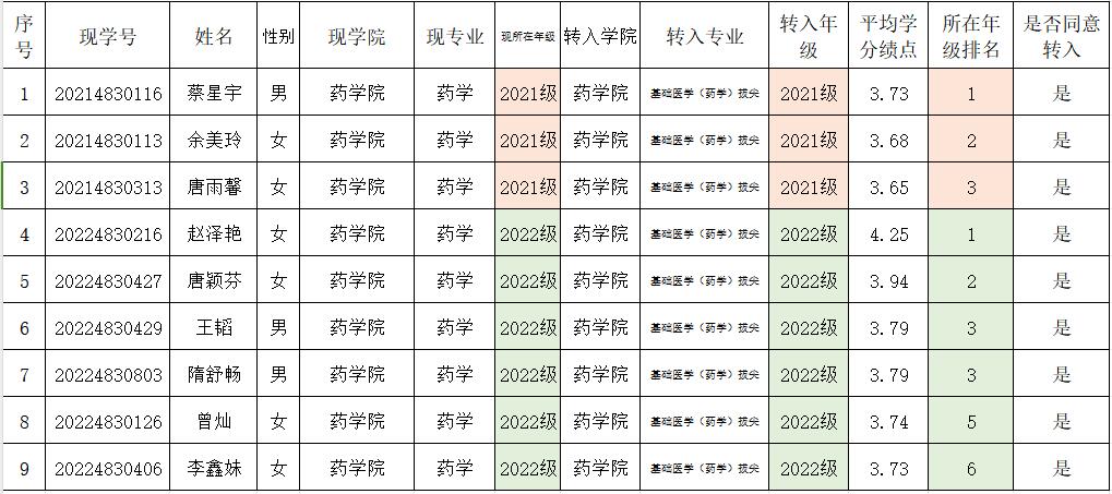 经员工本人申请、公司审核,按照在校期间平均学分绩点由高到低排列,公司拟同意蔡星宇等3人转入2021级基础医学(药学)拔尖班学习,赵泽艳等6人转入2022级基础医学(药学)拔尖班学习。现将名单公示如下,公示期为2023年10月13日至2023年10月15日18:00。如有异议,请以书面形式递交公司教务办,联系电话:0734-8281782。