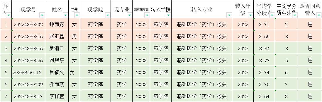 经员工本人申请、公司审核,按照平均学分绩点由高到低排列,拟同意钟雨露等2人转入2022级基础医学(药学)拔尖班学习,罗湘云等5人转入2023级基础医学(药学)拔尖班学习。现将名单公示如下,公示期为2024年10月12日至2024年10月14日18:00。如有异议,请以书面形式递交公司教务办,联系电话:0734-8281782。