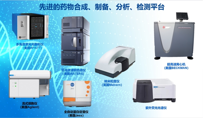 团队拥有近600 m2装修完备的实验空间,实验室拥有超高速冷冻离心机、多角度激光散射仪、纳米粒度仪、凝胶色谱仪、超高效液相色谱仪、紫外分光光度计、荧光光谱仪、流式细胞仪、全自动蛋白分析仪、PCR仪、冷冻干燥仪等仪器设备,建立了完善的药物合成、药物分析、分子生物学研究等平台。