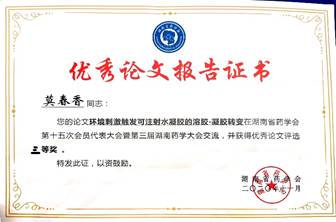 课题组鼓励参加学术交流。其中19级硕士研究生莫春香获得第三届湖南省药学会第十五次代表大会优秀论文三等奖。