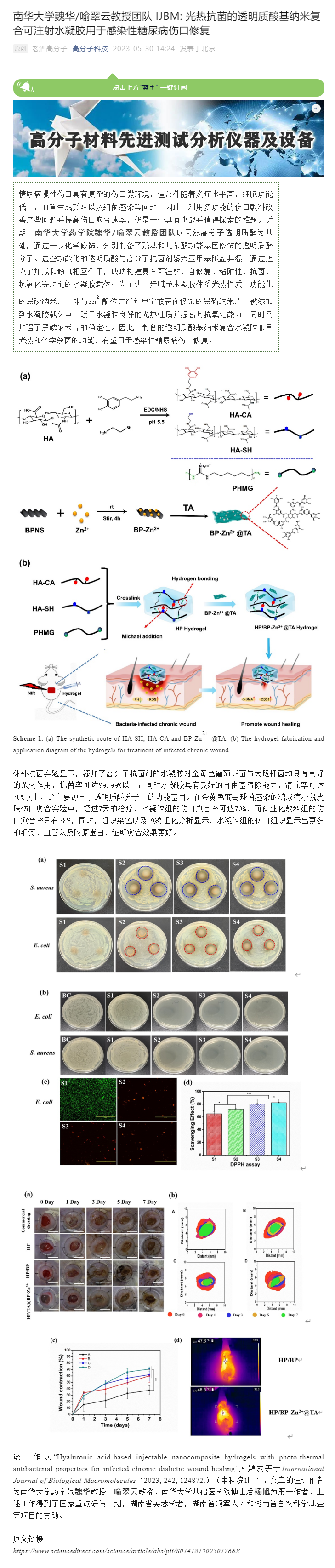 糖尿病慢性伤口具有复杂的伤口微环境,通常伴随着炎症水平高,细胞功能低下,血管生成受阻以及细菌感染等问题,因此,利用多功能的伤口敷料改善这些问题并提高伤口愈合速率,仍是一个具有挑战并值得探索的难题。近期,beats365魏华/喻翠云教授团队以天然高分子透明质酸为基础,通过一步化学修饰,分别制备了巯基和儿茶酚功能基团修饰的透明质酸分子。这些功能化的透明质酸与高分子抗菌剂聚六亚甲基胍盐共混,通过迈克尔加成和静电相互作用,成功构建具有可注射、自修复、粘附性、抗菌、抗氧化等功能的水凝胶载体;为了进一步赋予水凝胶体系光热性质,功能化的黑磷纳米片,即与Zn2+配位并经过单宁酸表面修饰的黑磷纳米片,被添加到水凝胶载体中,赋予水凝胶良好的光热性质并提高其抗氧化能力,同时又加强了黑磷纳米片的稳定性。因此,制备的透明质酸基纳米复合水凝胶兼具光热和化学杀菌的功能,有望用于感染性糖尿病伤口修复。
