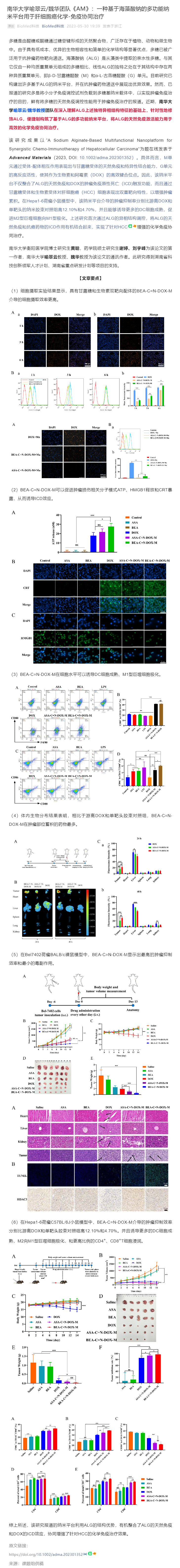 多糖是由醛糖或酮糖通过糖苷键形成的天然聚合物,广泛存在于植物、动物和微生物中。由于具有低成本、优异的生物相容性和简单的化学结构等显著优点,多糖已被广泛用于抗肿瘤药物靶向递送。海藻酸钠(ALG)是从藻类中提取的亲水性多糖。与其它仅由一种均质重复单元组成的多糖相比,线性ALG的独特之处在于其结构中存在两种异质重复单元,即β-D-甘露糖醛酸(M)和α-L-古洛糖醛酸(G)单元。目前研究已构建出许多基于ALG的纳米平台,并在抗肿瘤药物递送中展现出优异效果。然而,已报道的研究多是将小分子免疫调控试剂负载到多糖基纳米载体中,以实现肿瘤免疫治疗的目的,鲜有将多糖的天然免疫调控性能用于肿瘤免疫治疗的报道。近期,beats365官方网站喻翠云/魏华教授团队在深入理解ALG上述独特异相结构特征的基础上,针对性地修饰ALG,便捷制构筑了基于ALG的多功能纳米平台,将ALG的天然免疫激活能力用于高效的化学免疫协同治疗。