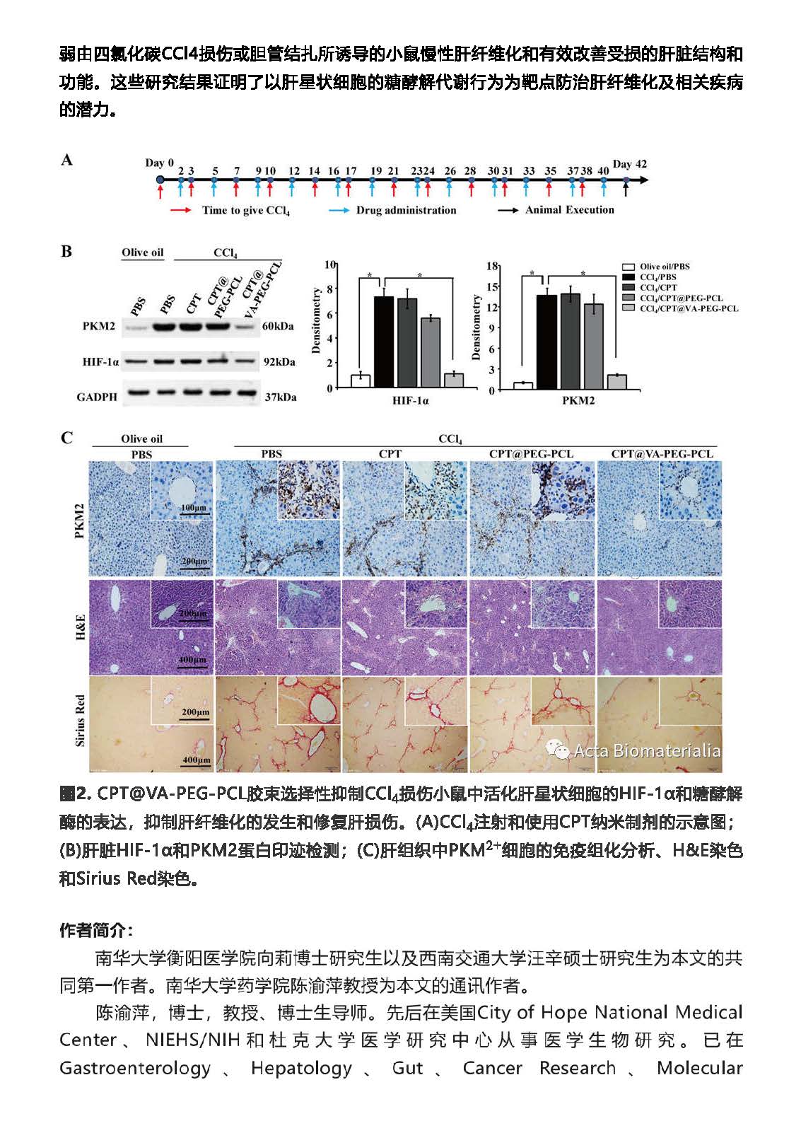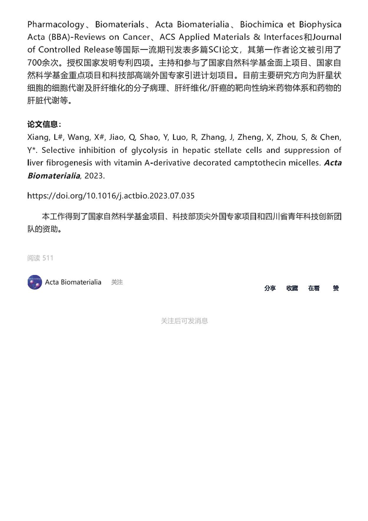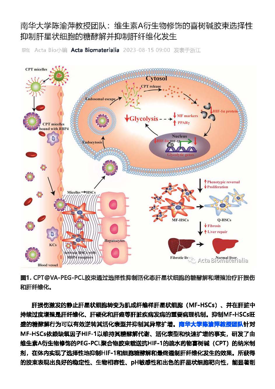 beats365官方网站高层次人才陈渝萍教授所带领的团队在Acta Biomaterialia期刊发表“维生素A衍生物修饰的喜树碱胶束选择性抑制肝星状细胞的糖酵解并抑制肝纤维化发生”学术论文。