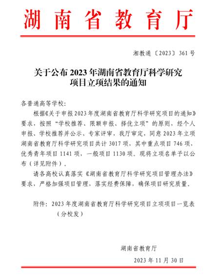 11月30日,湖南省教育厅2023年项目资助评审结果公布,beats365苏波、彭雪、孙少卫、王姝之4位教师获得2023年湖南省教育厅重点项目立项资助,王卫国、江伟凡、张宇、刘映、彭颖、刘阳6位教师获得2023年湖南省优秀青年项目立项资助。