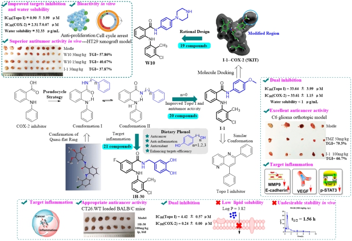 非甾体抗炎药(NSAIDs)已被证明能够改变肿瘤微环境、增强细胞凋亡和减少细胞迁移。基于NSAIDs的“老药新用”策略成为抗肿瘤药物发现的一种新型范式,该研发范式面临着副作用大、靶标亲和力和选择性不高等挑战。基于此,beats365王震教授团队围绕非甾体抗炎药的结构修饰及改造发现新型肿瘤候选药物开展了持续性的研究工作,并取得了系列成果(J. Med. Chem., 2022, 65, 10481-10505;Eur. J. Med. Chem.,2022, 240, 114560;Eur. J. Med. Chem.,2021, 226, 113817)。