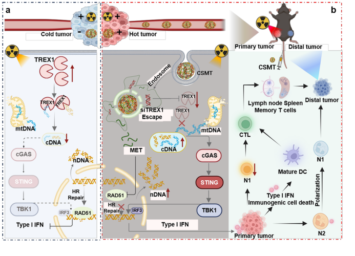 近日,喻翠云和魏华教授团队报道了一种特异性的基于二甲双胍(MET)的多功能纳米复合物CS-MET/siTREX1(CSMT)用于促进cDNA积累,以最大限度地实现放射免疫治疗并规避放疗抵抗的研究。在本研究中,该纳米复合物由双胍装饰的CS(CS-MET)作为载体和3'-5'DNA核酸外切酶TREX1 siRNA(siTREX1)作为治疗基因组成,通过放大初始DNA损伤信号来增强RT诱导的抗肿瘤免疫效果。