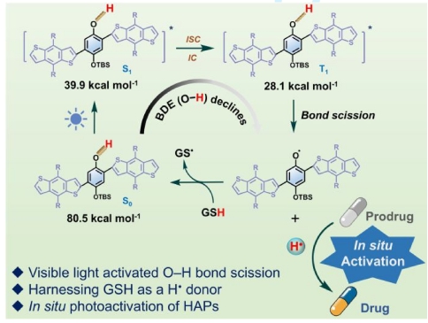 传统光动力疗法(PDT)通过氧依赖途径产生活性氧(ROS),但其临床疗效在乏氧肿瘤微环境中受到显著制约。近年来,发展生物友好型非氧自由基介导的疾病治疗策略展现出潜在的价值。在众多非氧自由基中,氢自由基(H•)具有独特的强还原性与促氧化能力特性,已在抗肿瘤领域开展广泛研究(J. Am. Chem. Soc.,2021,143,868 &Angew. Chem. Int. Ed.,2023,135,e202214991)。然而,当前基于新型作用机制的H•发生器的发展及其应用探索仍较为有限。此外,肿瘤组织的乏氧异质性属性导致乏氧敏感前药(HAPs)时空特异性激活受限,制约了其临床转化潜力。基于此,本研究通过分子设计调控酚类光敏剂的激发态特性,不仅探索了H•产生新机制和实现了H•的高效光控释放,而且建立了基于H•介导的HAPs胞内激活新范式。以H•作为工具为发展肿瘤微环境适配性治疗提供新策略和为构建新型精准化疗协同增效治疗体系提供新方法。