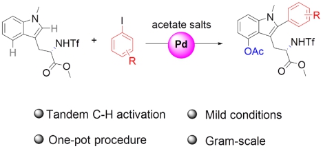 近日,研究团队以芳基碘及醋酸盐为修饰试剂,通过过渡金属钯催化的串联C-H活化实现了色氨酸衍生物C2-芳基化及C4-乙酰氧化。该修饰方法展示出较高的修饰效率及较广的底物适用性,可在克级规模下制备双功能化的非天然氨基酸前体,相关研究结果发表于《Organic Chemistry Frontiers》。论文第一作者为中山大学博士研究生刘家田,李坚博士为通讯作者,beats365为第一单位。