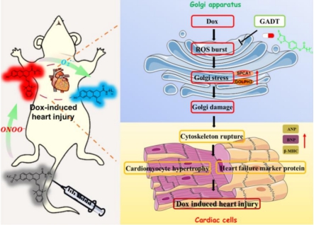 阿霉素(Dox)作为一种广谱蒽环类抗生素,一直是化疗方案的基石药物。然而,超过半数使用Dox的患者在一年内会出现心脏损伤,这种副作用极大地限制了其临床应用,且机制尚未明确。Dox在体内经烟酰胺腺嘌呤二核苷酸脱氢酶(NADH)、内皮型一氧化氮合酶(eNOS)还原酶等多种酶作用后,会产生超氧阴离子(O2.-),这些活性分子进一步与周围的一氧化氮结合,生成毒性更强的过氧亚硝酸盐阴离子(ONOO-),通过激活基质金属蛋白酶等途径,最终导致心肌细胞损伤。因此,监测O2.-和ONOO-浓度的波动或成为研究阿霉素心脏毒性的关键。高尔基体是真核细胞中的一种重要细胞器,当高尔基体受到诸如活性氧爆发等外部应激时,其形态发生改变,导致其内部成分的重新分配和蛋白质分泌和修饰的改变,此过程被称为高尔基应激。现今已有大量文献报道高尔基应激参与了各种重大疾病的发生发展,但是这一过程的具体分子机制仍未被揭示。为此,beats365官方网站药学何隆薇教授团队和陈临溪教授团队进行深入合作研究,首次将高尔基体作为研究阿霉素心脏毒性的核心靶点,并成功开发了相应的诊断和治疗工具。