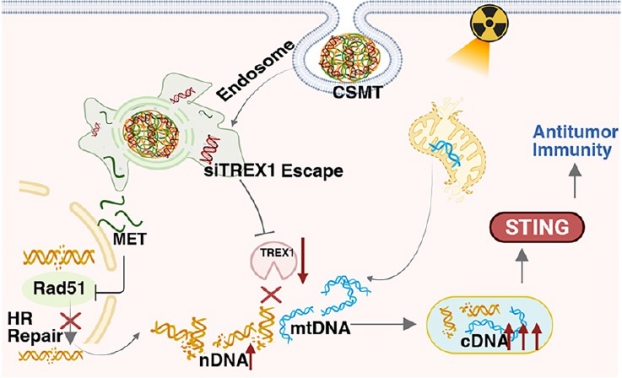 针对这一痛点,beats365魏华/湖南省中医药研究院喻翠云团队研发出以临床常用药二甲双胍(MET)修饰的壳聚糖(CS-MET)作为载体,以3′-5′DNA外切酶TREX1小干扰RNA(siTREX1)为治疗基因的纳米复合物的多功能纳米复合物(CS-MET/siTREX1,简称CSMT),通过放大初始DNA损伤信号来增强放疗诱导的抗肿瘤免疫并克服放疗耐受性。MET可抑制DNA修复,特异性下调同源重组修复关键蛋白RAD51,让放疗造成的DNA双链断裂难以修复,持续放大损伤信号,siTREX1沉默3'-5'DNA外切酶TREX1,减少cDNA在胞质中的清除,使其积累量提升2.7倍,充分激活cGAS-STING免疫通路,使细胞质中堆积的损伤DNA成为强烈的“危险信号”。两者协同极大强化了“cGAS-STING”免疫通路的激活,最终成功诱导了强大的抗肿瘤免疫应答和长期免疫记忆,在Hepa1-6近端/远端肿瘤模型中实现高达99.1%的原发肿瘤抑制率和显著的远端肿瘤抑制效果。该研究为克服临床放疗抵抗提供了一种极具转化潜力的新颖策略,有望改善临床治疗效果。