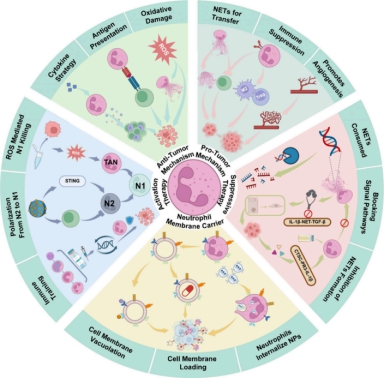 本综述对肿瘤微环境中中性粒细胞异质性的发展及其促瘤和抗瘤机制进行了全面的分析,特别介绍并分析了新兴的中性粒细胞靶向药物递送平台和创新的重新编程中性粒细胞功能的方法。肿瘤衍生的细胞因子可将中性粒细胞极化为抗肿瘤的N1表型和促肿瘤的N2表型。N1TAN通过释放活性氧(ROS)、中性粒细胞胞外诱捕网(NETs)和免疫调节分子直接杀死肿瘤细胞并增强适应性免疫;而N2TAN通过NETs构建转移前生态位、分泌促血管生成因子和塑造免疫抑制微环境来加速肿瘤进展。基于肿瘤相关中性粒细胞(TAN)的功能可塑性,研究团队提出了三种创新治疗方向,为后续研究提供了明确路径。一是中性粒细胞载体疗法。利用中性粒细胞向肿瘤炎症部位趋化的特性,构建膜包裹的纳米颗粒(如aNEM NPs),实现化疗药物或免疫激动剂的精准递送,从而降低全身毒性。二是抑制NETs的促癌作用。通过使用PAD4抑制剂阻断NETs的形成,或者利用DNase I降解已经形成的NETs,抑制肿瘤转移与化疗耐药。三是动员抗瘤功能。通过β-葡聚糖“训练”中性粒细胞,诱导其向N1表型极化,或使用MnO2纳米颗粒激活STING通路,增强抗瘤免疫。该研究为基于中性粒细胞的精准免疫治疗提供了理论基础,并指明了未来研究方向,包括中性粒细胞亚群的特异性标志物鉴定和功能调节机制的深入探索。
