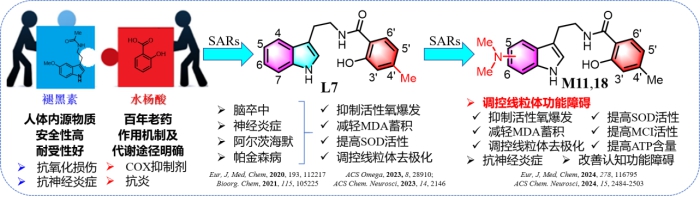 基于此,本团队通过拼合抗氧化损伤及神经炎症的褪黑素片段(人体内源物质:高安全性和高耐受性)和抗炎抗氧化的水杨酸片段(百年老药:作用机制及代谢途径明确),设计合成一系列N-水杨酰色胺类衍生物(近200个)。通过系统性的构效关系研究,我们发现该系列化合物安全性高、药代动力学性质优异且能高效透过血脑屏障,符合中枢神经系统药物的成药标准。在后续的机制探究及靶标验证过程中,我们明确了该系列化合物可调控线粒体功能障碍,发挥抗神经炎症、改善认知功能障碍等一系列作用。