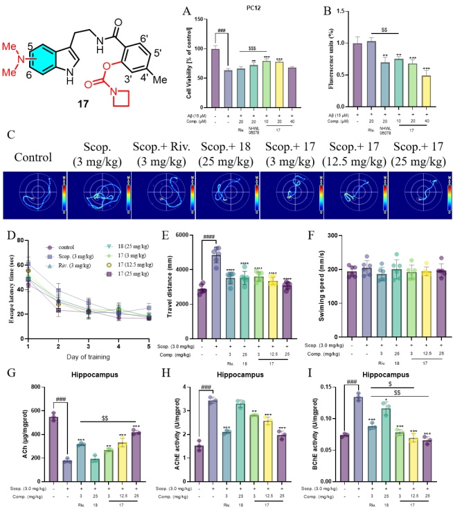 我们在NSTs载体骨架上拼合氨基甲酸酯片段,已合成多系列近100个化合物,发现引入氨基甲酸酯片段后能够显著提升化合物对ChEs的抑制活性,且保留载体骨架的活性(Bioorg.Chem.,125,2022, 125,105844;Eur.J.Med.Chem.,2022, 229,11404)。值得注意的是,该骨架本身天然具有BChE选择性,为进一步开发选择性BChE抑制剂提供了前提条件(Bioorg.Chem.,2022,127,105993;Eur.J.Med.Chem.,2025, 299,118071)。而M11, 18相较于L7表现出更为优异的抗神经炎症活性、神经保护作用和BBB通透性,我们以其为载体骨架,在水杨酸环上引入氨基甲酸酯片段,设计合成了17个化合物,以期得到具有优异BChE选择抑制活性及更强抗神经炎症活性的多功能抗AD分子。其中化合物17表现出优异的BChE抑制活性和极高选择性(eqBChE= 0.074±0.0015nM,eeAChE> 20μM,SI> 270000)。进一步探究发现其具有优异的抗炎活性(COX-2IC50=0.11 ± 0.01 μM),显著的Aβ神经毒性的保护作用和良好的BBB透过性(Pe= 7.18 × 10-6cm/s)(图3A、3B)。动物实验表明,17可以显著改善东莨菪碱诱导的小鼠认知缺陷、焦虑心理及学习记忆障碍,效果与卡巴拉汀相当(图3C-F)。尤为重要的是,17能够显著改善AD小鼠海马组织胆碱能生物标志物(AChE、BChE、ACh)至正常生理范围,且主要是通过抑制BChE活性来提高小鼠脑内ACh的含量(图3G-I)。表明化合物17是一极具潜力的多功能抗AD先导化合物,为抗AD药物的研发提供了新的选择。