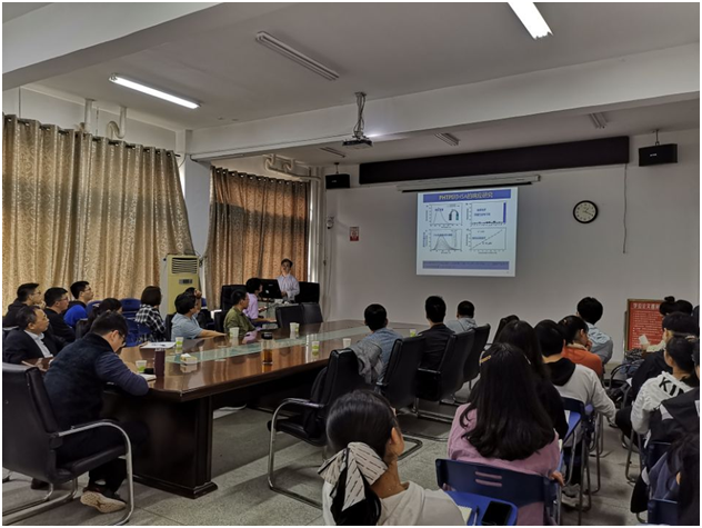 曾文彬教授从光学诊断和光学治疗的研究背景入手,介绍了荧光应用于化学传感、细胞成像、药物筛选和切除肿瘤等方面,同时指出了荧光存在聚集诱导淬灭的关键问题。针对荧光易淬灭的现象,曾教授课题组在四苯基乙烯的研究基础上设计、合成了新颖的AIE荧光团并应用于检测汞离子、亚硫酸根离子、甲醛分子等,合成并筛选Bola型探针。在此基础上,曾教授还介绍了其在脑胶质瘤成像试剂的研究、细菌成像感染治疗的多功能应用、多功能抗菌肽的设计策略等。曾教授的报告内容精彩,逻辑清晰,语言生动形象。听完报告后,深刻体会到了理论知识应用于生活的强大,在座师生都受益匪浅。