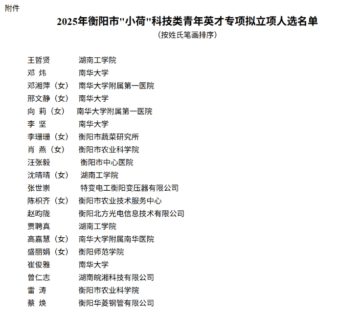 近日,根据中共衡阳市委人才工作领导小组办公室、衡阳市科学技术协会《关于开展2025年衡阳市“小荷”科技类青年英才专项申报工作的通知》(衡市科协字〔2025〕9号)文件精神,经申报、推荐、评审、考察、个人事项审查等程序,评选出2025年市“小荷”科技类青年英才专项拟立项人选20名。其中,beats365李坚博士成功入选2025年衡阳市"小荷"科技人才。