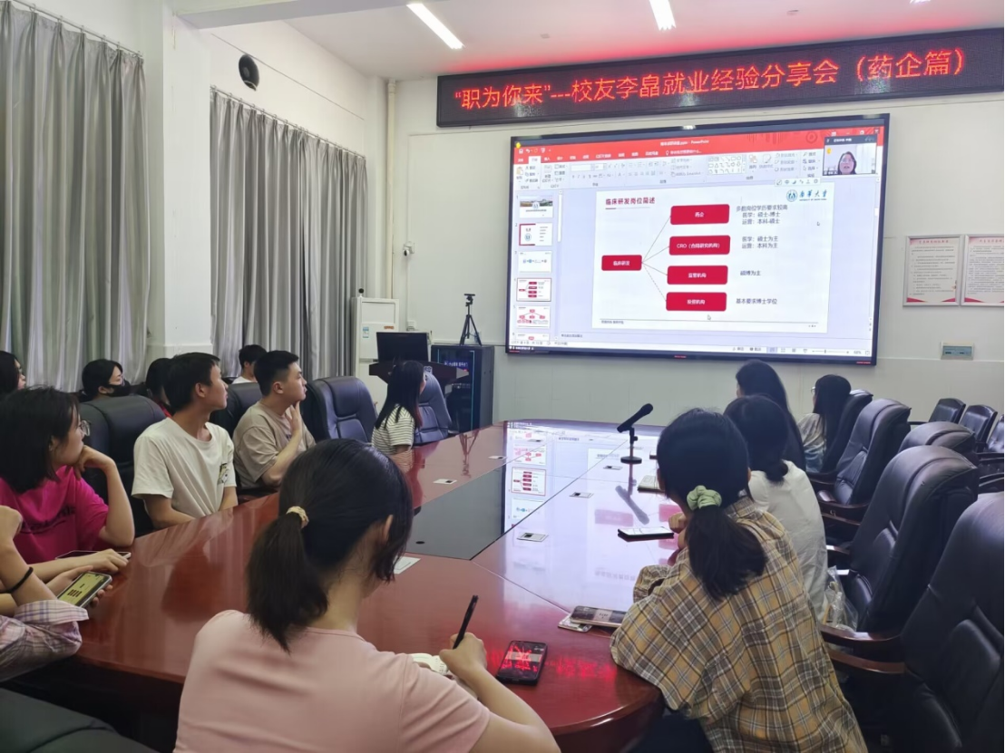 陈健平对李皛和一同参会的员工黄亚飞、唐宇表示欢迎和感谢,对他们体现出南华药学学子爱校荣校、感恩母校的情怀表示充分肯定。李皛现任山东绿叶制药有限公司医学顾问,博士毕业于日本熊本大学药学部药代动力学专业,后在北京大学临床药理研究所从事临床药理、药物开发策略博士后研究工作。她从临床药物试验研发岗位简述、岗位信息收集、简历撰写要点、长期准备等方面作了分享,她回顾了大学时代的生活点滴以及毕业之后初入职场的社会体验。她与学弟学妹分享了个人的人生奋斗目标,以及追逐人生奋斗目标过程的从业与创业经历,并通过自身的丰富经历鼓励同学们要树立“终身学习”、“有规划的设置挑战”等价值观念。浙江大学博士生导师2006级优秀员工唐宇、上海辉启生物医药科技有限公司化学总监2006级优秀员工黄亚飞博士对学弟学妹们在生涯指导、求职面试中遇到的问题和困惑认真倾听、积极回应。现场气氛轻松融洽,活跃热烈。