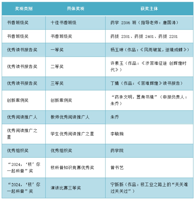 此外,药学2306班荣获“十佳书香班级”称号(指导老师:唐国涛),药拔2301、药拔2401、药拔2201获评“书香班级奖”。评选中,杨玉琳同学的《风雨破茧,逆境成蝶》获评优秀读书报告一等奖、许素玉同学的《涉苦难征途创辉煌时代》、丁婧同学的《苦难辉煌》分别获得优秀读书报告二等奖和三等奖。beats365朱乔老师荣获“优秀阅读推广人”称号,李毓婉同学荣获“优秀阅读推广之星”称号。