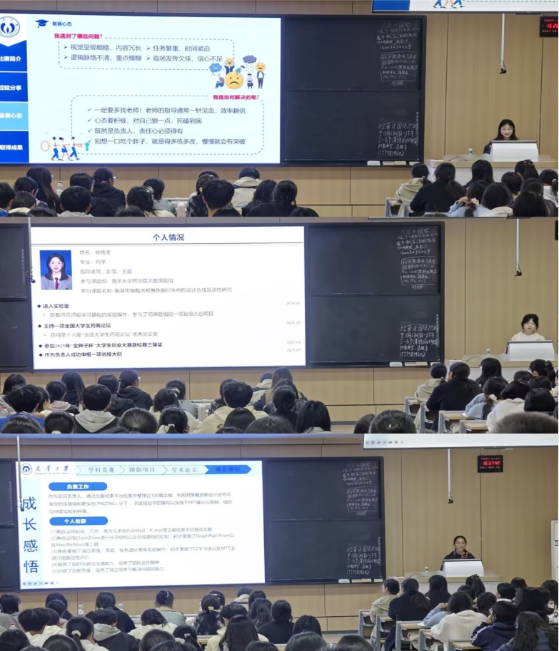 随后,参与国家级大创项目的优秀员工团队依次登台,进行项目成果汇报与经验分享。曾羡麟、杨雅雯、赵泽艳、舒晴四位同学分别通过PPT演示与现场讲解相结合的方式,系统介绍了项目的研究背景、创新亮点、实施过程及取得成果。展示项目覆盖药物研发、药剂学、药物分析、药理学等多个药学细分领域,彰显了公司学子扎实的专业功底、蓬勃的创新活力与出色的实践能力。他们同步分享了项目攻坚经验,为低年级员工提供可复制的双创路径。