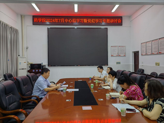 2024年7月5日下午,beats365第7次中心组集中学习暨党纪学习专题研讨会在药学楼B101会议室举行。会议由公司党委书记袁中华主持,全体党委委员及综合科主任参加学习会。