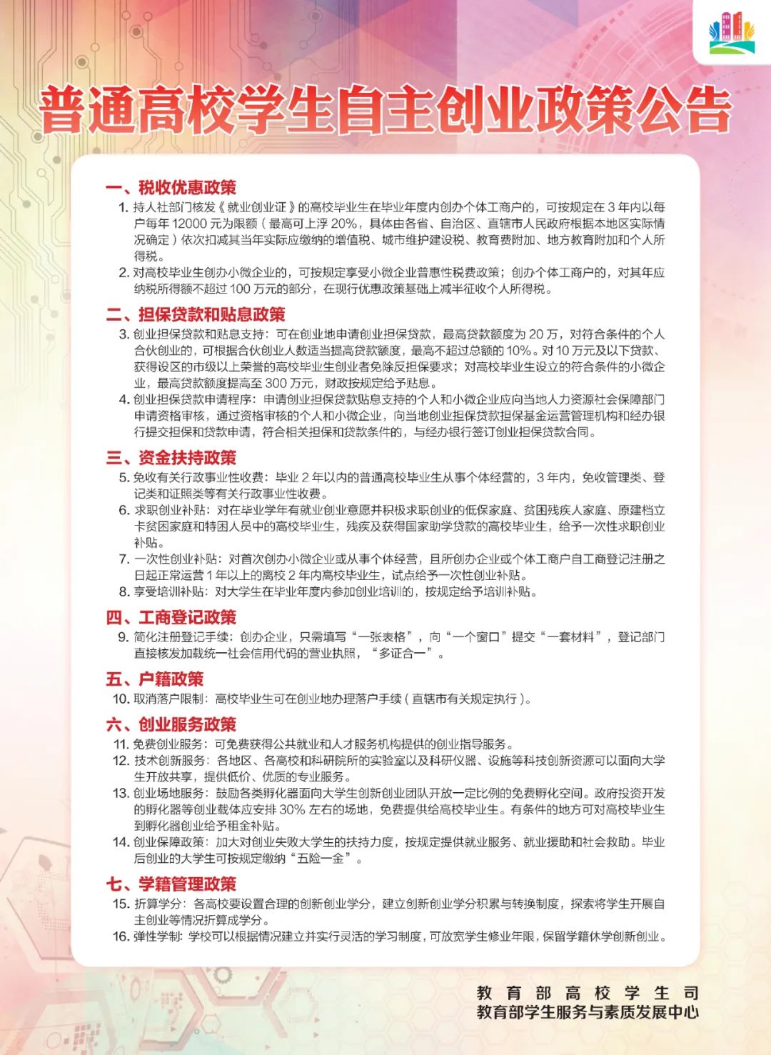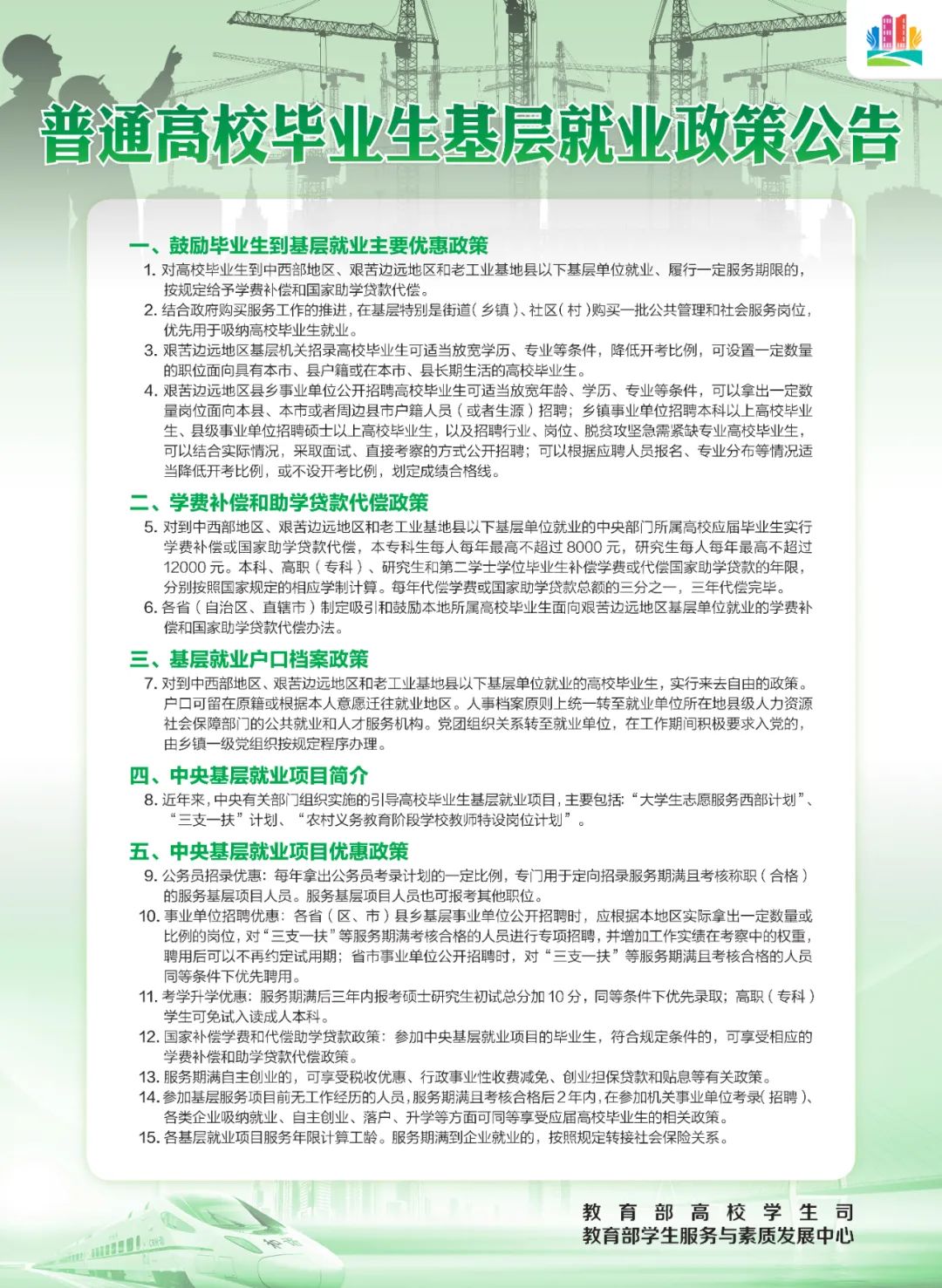 高校毕业生就业创业、应征入伍关系千万家庭幸福,关系财富创造、高质量发展,都有哪些好政策好服务来支持?这些你都知道了吗?请收好这份由教育部高校员工司、教育部员工服务与素质发展中心发布的普通高校毕业生基层就业政策、普通高校员工自主创业政策、普通高校员工应征入伍政策、普通高校毕业生就业服务政策。超给力的政策措施,随时随地掌握!