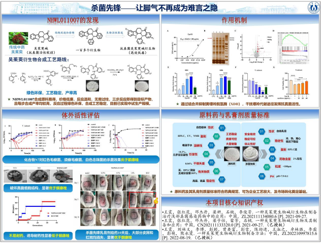 据世界卫生组织数据,浅部真菌感染影响全球20%-25%人口,我国60%以上由红色毛癣菌引起,现有药物存在耐药性强、疗程长等问题。beats365王震教授团队,从传统中药吴茱萸中提取活性成分,经结构改造研发出全新化合物NHWL011007,其乳膏制剂“杀菌先锋”具有起效快(24-48小时快速抑菌)、疗程短(1-2周)、不易耐药等显著优势,体外实验显示对白色念珠菌、红色毛癣菌的杀菌效果优于一线药物酮康唑,且安全性更高。