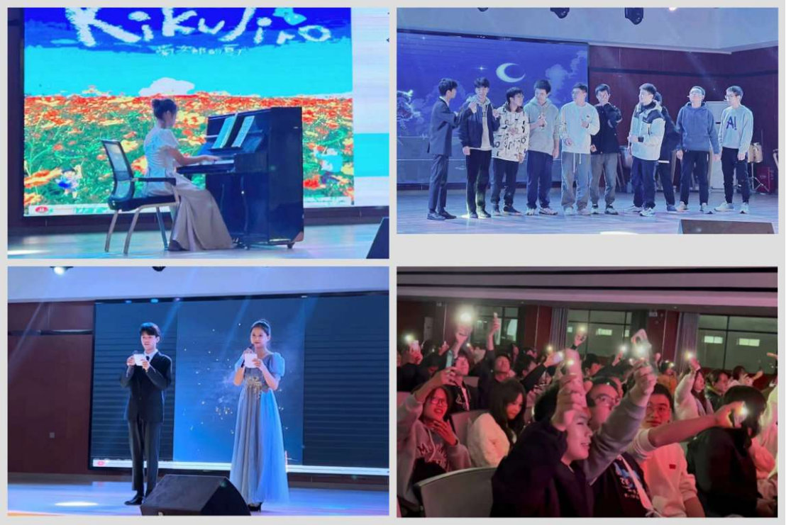 新星璀璨,新生才艺大赛在熠熠灯辉中拉开帷幕。各位选手都带着精心准备的才艺表演,呈现了一个个青春活力的舞台。他们或深情独唱,让人沉醉歌曲的世界;或钢琴独奏,让人感受宁静的夜晚;亦或激情合唱,让人充满奋斗的动力……现场温情歌舞环绕,欢声笑语交织,舞台上的选手们与台下的观众们共同摇晃手臂,点亮属于今晚的璀璨“星空”。除了精彩绝伦的表演,赛中的小游戏击鼓传花,筷子运输,更是将大赛的现场氛围推至高潮。