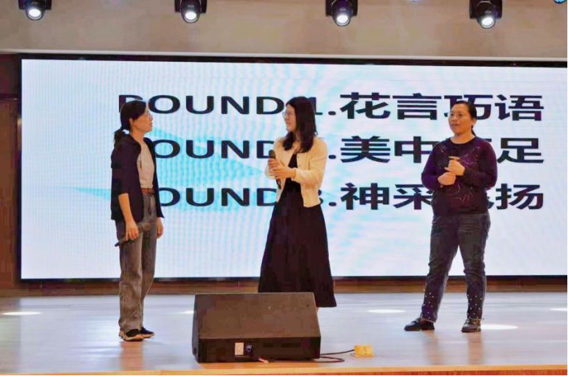 即兴主持环节紧张而有序,随机抽取的题目极大考验选手随机应变和控场能力。集体朗诵环节,十位选手带来的《中国红》为观众展示了一场“红色”的盛宴,传递对于祖国的热爱。绕口令挑战、词语接龙互动环节,观众们跃跃欲试,老师们的加入将大赛氛围推向高潮。