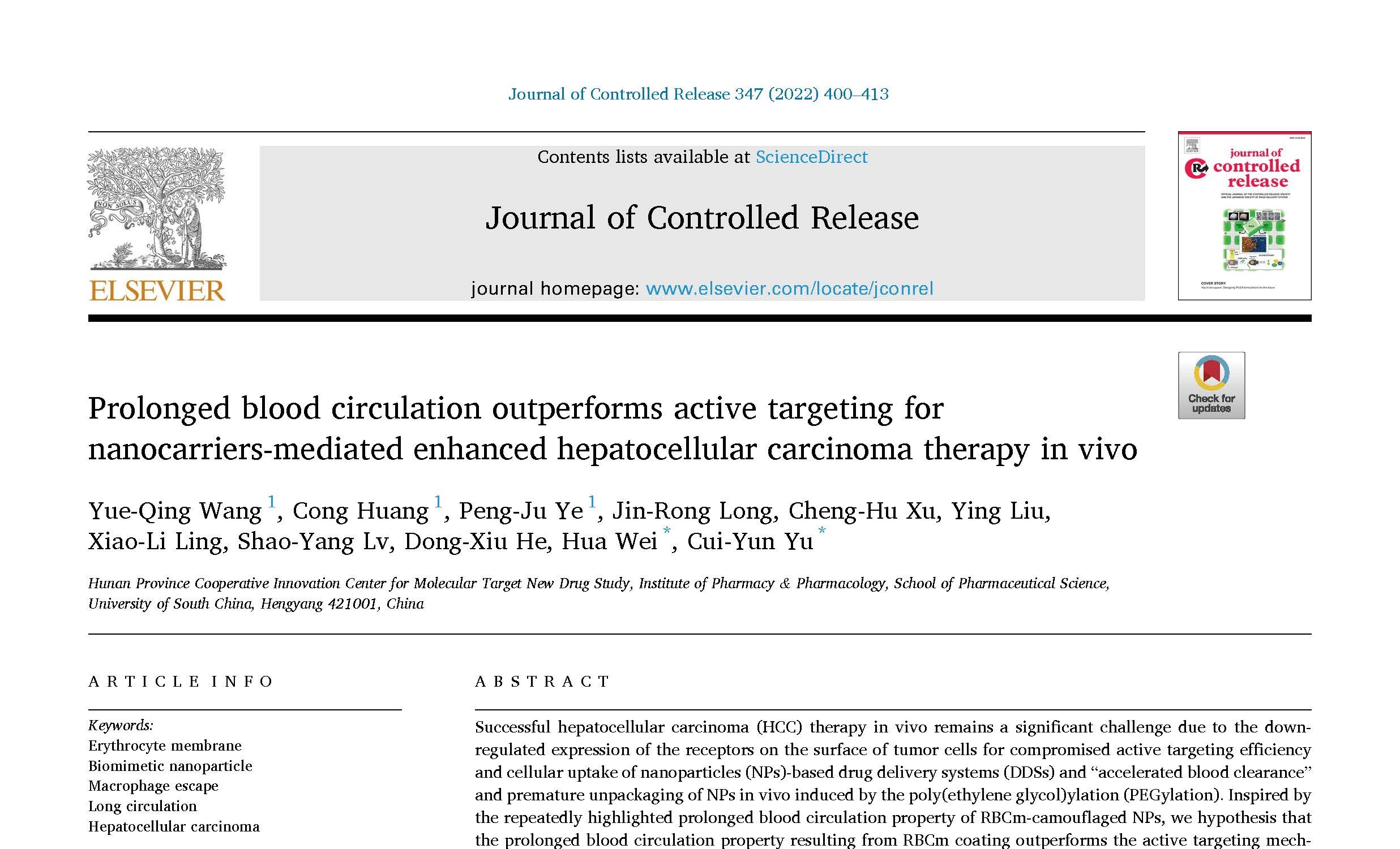近日,beats365魏华教授和喻翠云教授联合科研团队在药剂学国际一流期刊Journal of Controlled Release(简称JCR,医学1区,TOP期刊,IF:9.776)上发表了题为“Prolonged Circulation Outperforms Active Targeting for Enhanced Hepatocellular Carcinoma Therapy(2022, 347, 400-413.)”的研究论文。该研究通过红细胞膜包裹天然多糖基聚合物前药纳米粒子构筑了仿生纳米载体,在小鼠体内实现了针对肝癌的高效治疗。研究首次揭示了红细胞膜赋予仿生纳米载体的血液长循环性能比纳米载体自身的肝癌细胞主动靶向性能在针对肝癌的体内治疗中发挥着更为重要的作用。仿生纳米载体在大鼠体内的血液循环半衰期(t1/2)是聚合物前药纳米粒子的3倍,是小分子化疗药物阿霉素的3.5倍,因而仿生纳米载体在荷瘤小鼠体内展现了最好的抑瘤效果。该研究为肝癌的临床高效治疗提供了理论指导。beats365硕士研究生汪月琴、黄聪和叶鹏举为共同第一作者,beats365喻翠云教授和魏华教授为共同通讯作者。这是该研究团队在近一年的时间内,连续在JCR上发表的第五篇科研成果。