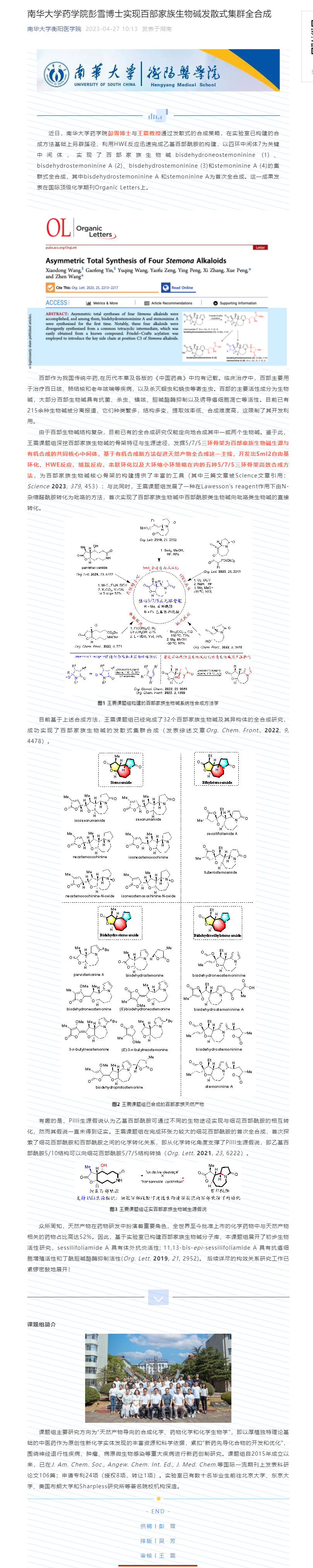 beats365/肿瘤微环境响应药物研究湖南省重点实验室彭雪博士与王震教授通过发散式的合成策略,在实验室已构建的合成方法基础上另辟蹊径,利用HWE反应迅速完成乙基百部酰胺的构建,以四环中间体7为关键中间体,实现了百部家族生物碱bisdehydroneostemoninine (1)、bisdehydrostemoninine A (2)、bisdehydrostemoninine (3)和stemoninine A (4)的集群式全合成,其中bisdehydrostemoninine A 和stemoninine A为首次全合成。这一成果发表在国际顶级化学期刊Organic Letters上。