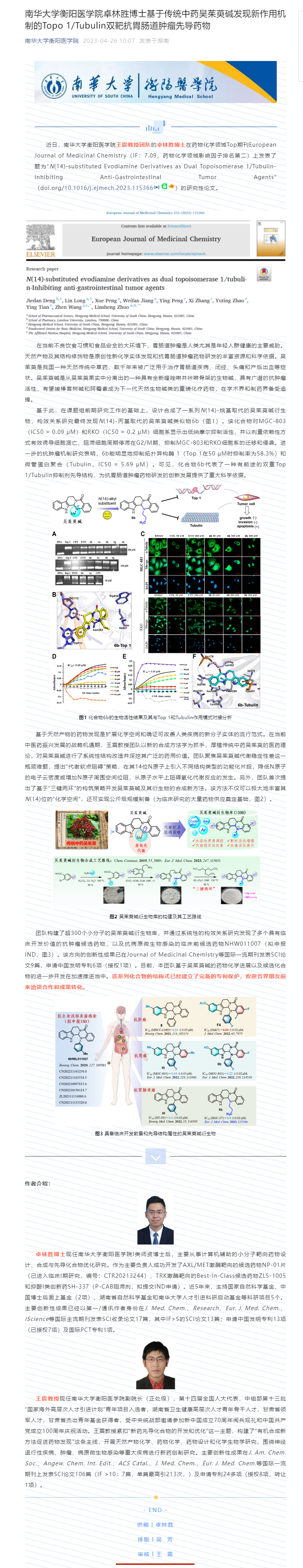 近日,beats365官方网站衡阳医公司、肿瘤微环境响应药物研究湖南省重点实验室王震教授团队的卓林胜博士在药物化学领域Top期刊European Journal of Medicinal Chemistry(IF:7.09,药物化学领域影响因子排名第二)上发表了题为“N(14)-substituted Evodiamine Derivatives as Dual Topoisomerase 1/Tubulin-Inhibiting Anti-Gastrointestinal Tumor Agents”(doi.org/10.1016/j.ejmech.2023.115366)的研究性论文。
