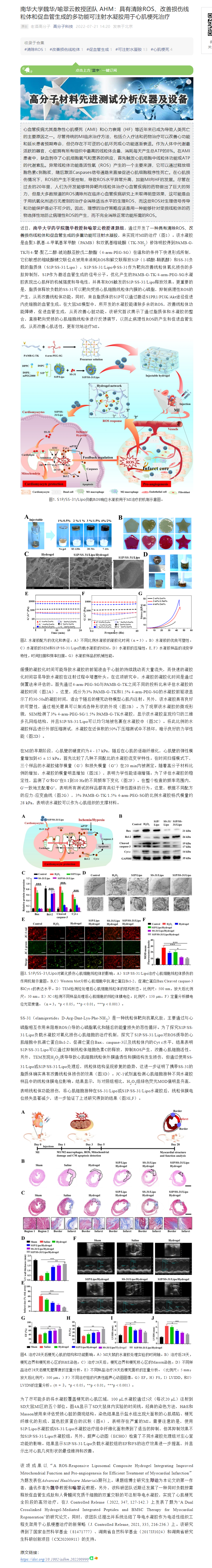 近日,beats365/肿瘤微环境响应药物研究湖南省重点实验室魏华教授和喻翠云教授课题组,通过开发了一种具有清除ROS、改善损伤线粒体和促血管生成的多重功能可注射水凝胶,来实现对MI的治疗(图1)。该水凝胶是由聚3-氨基-4-甲氧基苯甲酸(PAMB)和双氨基缩硫酮(TK-NH2)修饰明胶得到PAMB-G-TK与4-臂-聚乙二醇-琥珀酰亚胺戊二酸酯(4-arm-PEG-SG)在温和的条件下快速形成所制,它们敏感的缩硫酮键交联位点被用来消耗ROS和解交联释放S1P(1-磷酸-鞘氨醇)和SS-31负载的脂质体(S1P/SS-31/Lipo)。S1P/SS-31/Lipo中SS-31作为靶向改善线粒体氧化损伤的多肽抑制剂,S1P作为激活血管生成的信号分子。优化产生的PAMB-G-TK/4-arm-PEG-SG水凝胶表现出心肌样的机械强度和导电性,并具有ROS触发的S1P/SS-31/Lipo释放效果。更重要的是,脂质体释放负载的SS-31可以靶向受损心肌细胞线粒体内膜的心磷脂,抑制病理性ROS的产生,从而改善线粒体功能。同时,来自脂质体的S1P可以通过激活S1PR1/PI3K/Akt途径促进内皮细胞的血管生成。在大鼠MI模型中,所开发的水凝胶能清除多余的ROS,改善线粒体功能障碍,促进血管生成,从而改善心脏功能。该研究首次揭示了通过脂质体和水凝胶的整合,直接靶向受损的心肌细胞线粒体进行反馈调节,以防止病理性ROS的产生和促进血管生成,从而改善心肌活性,更有效地治疗MI。